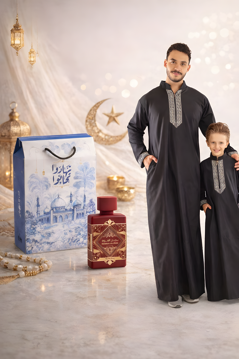تحتوي الهدية على: مصحف كريم لتدبر القرآن، مصليّة عالية الجودة لأوقات الصلاة، ميخرّة أنيقة تضيف لمسة فاخرة، وكارت أذكار لتذكيره بالخير والدعاء.